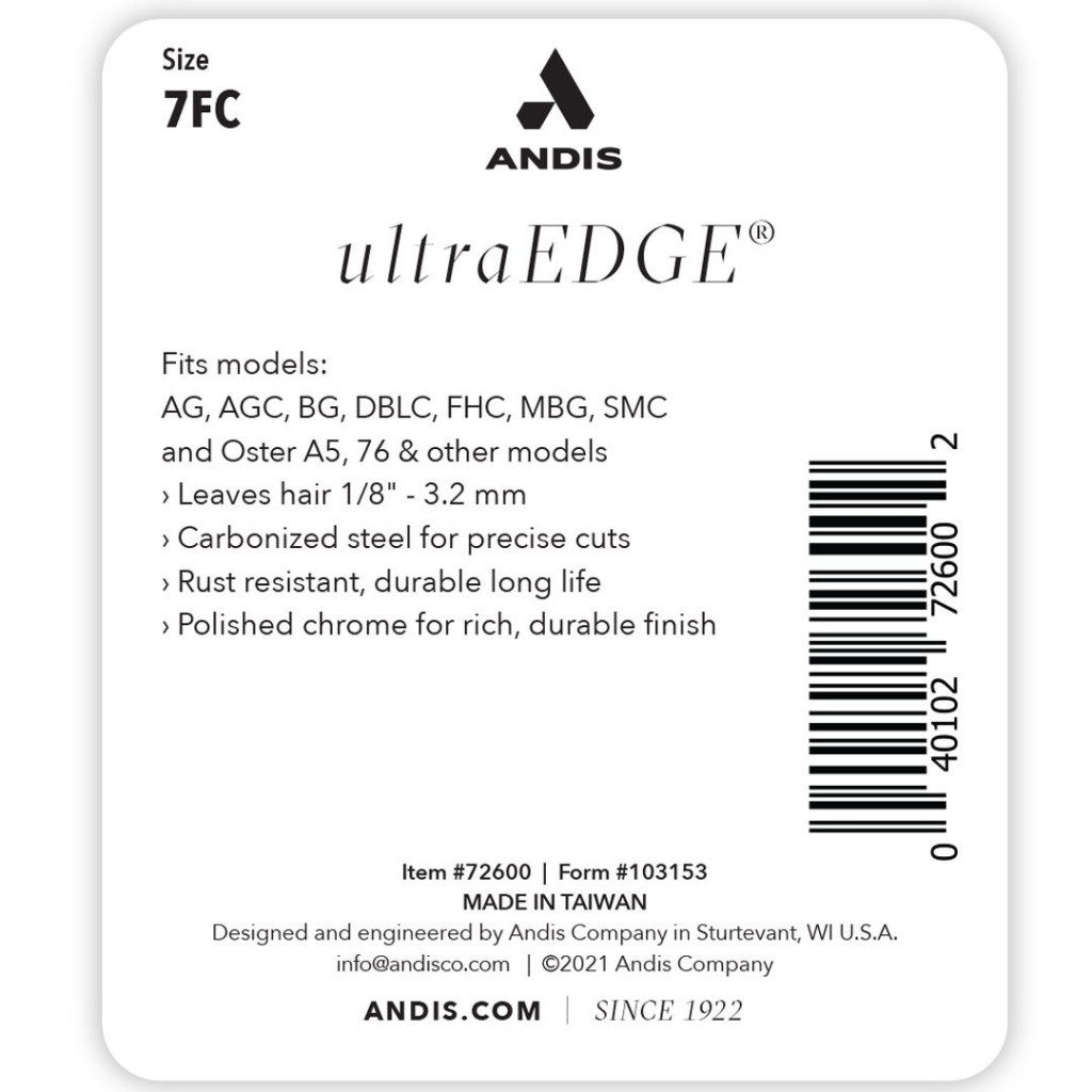 Andis UltraEdge 7FC je profesionalna oštrica od nehrđajućeg čelika koja pruža duljinu reza od 3,2 mm. Oznaka FC (Finish Cut) znači da je raspored zubaca gušći te ostavlja glađu i ujednačeniju površinu od rjeđe nazubljenih varijanti. Odličan je odabir za grooming salone i zahtjevne vlasnike kućnih ljubimaca za estetsko skraćivanje dlake na tijelu.