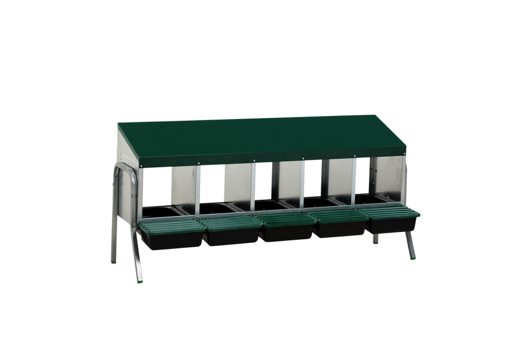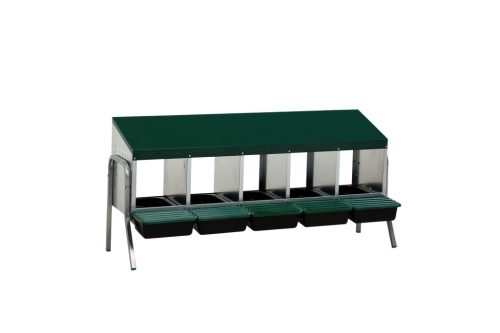 Praktično, 5-dijelno tojo gnijezdo s plastičnim dnom i nogama za male i srednje farme nesilica. Pocinčani metal osigurava čvrstu konstrukciju, lako čišćenje zahvaljujući plastičnom ulošku. Udobno sakupljanje jaja s izvlačivim plastičnim dnom. Povišen dizajn za jednostavan pristup i bolju higijenu.